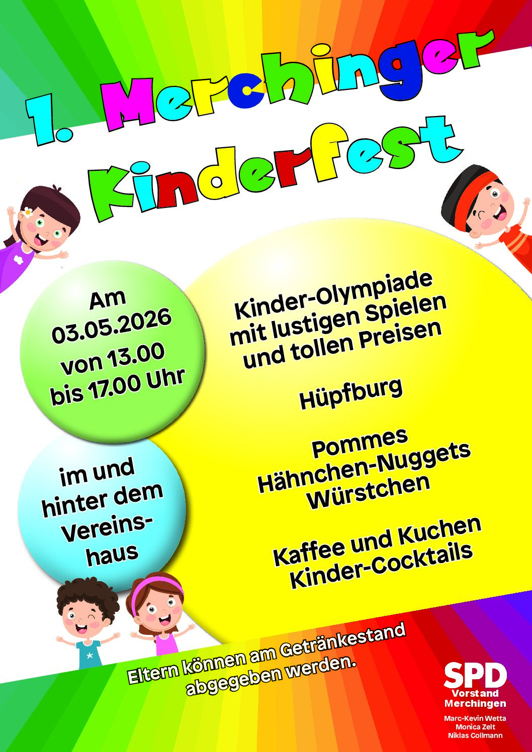 Der Vorstand der SPD Merchingen lädt alle Kinder und Erwachsenen herzlich zum ersten Merchinger Kinderfest am 3. Mai 2026 ab 13 Uhr ein. Freut euch auf spannende Spiele, abwechslungsreiche Unterhaltung…